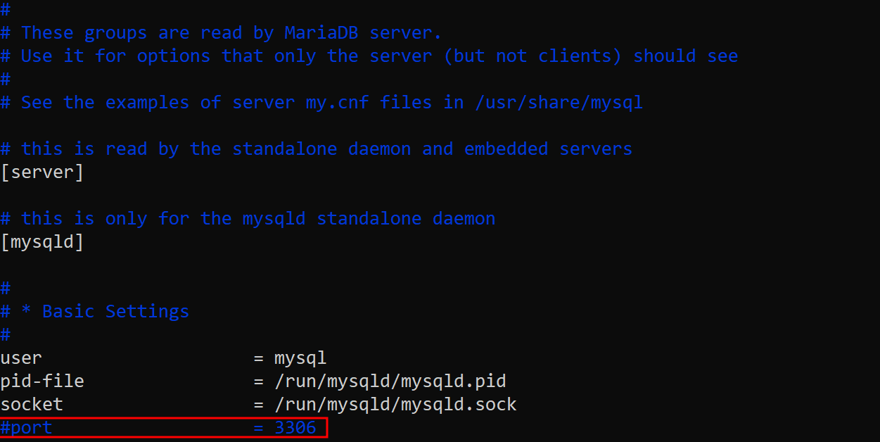 $ sudo vi /etc/mysql/mariadb.conf.d/50-server.cnf