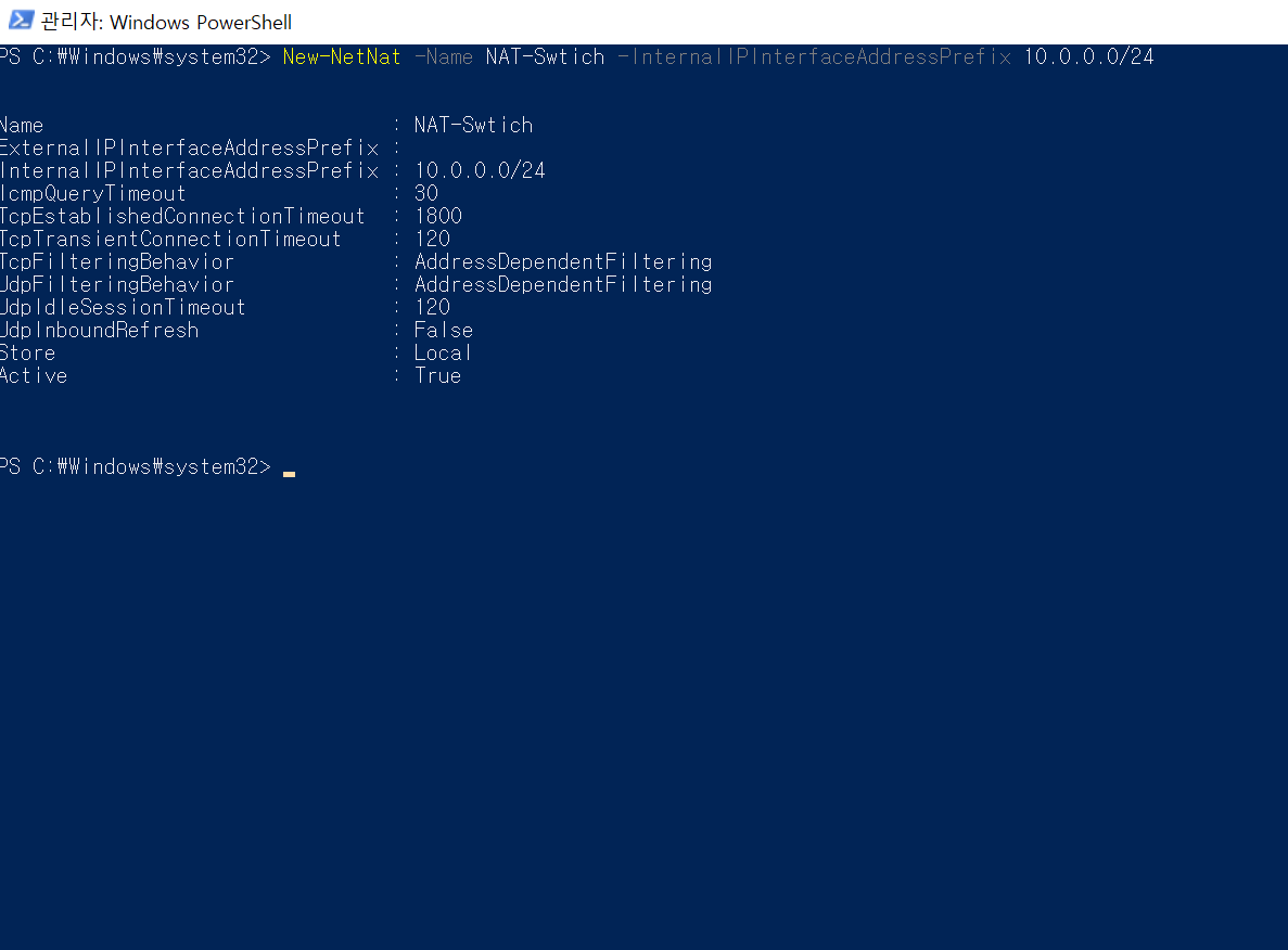 > New-NetNat -Name NAT-Swtich -InternalIPInterfaceAddressPrefix 10.0.0.0/24