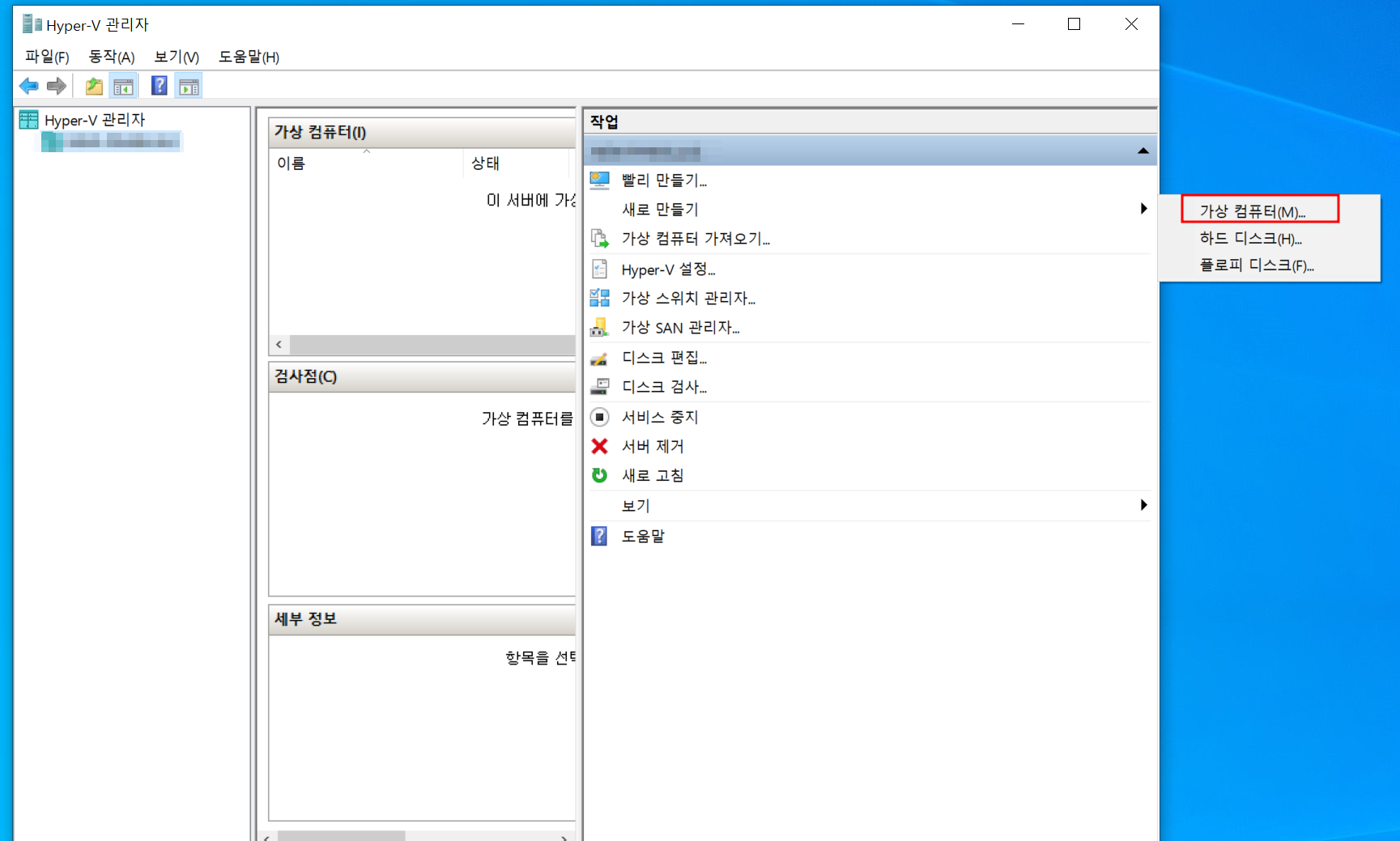 2) Hyper-V를 실행하여 위 그림처럼 가상 컴퓨터를 클릭하여 하나 만들 준비를 합니다.