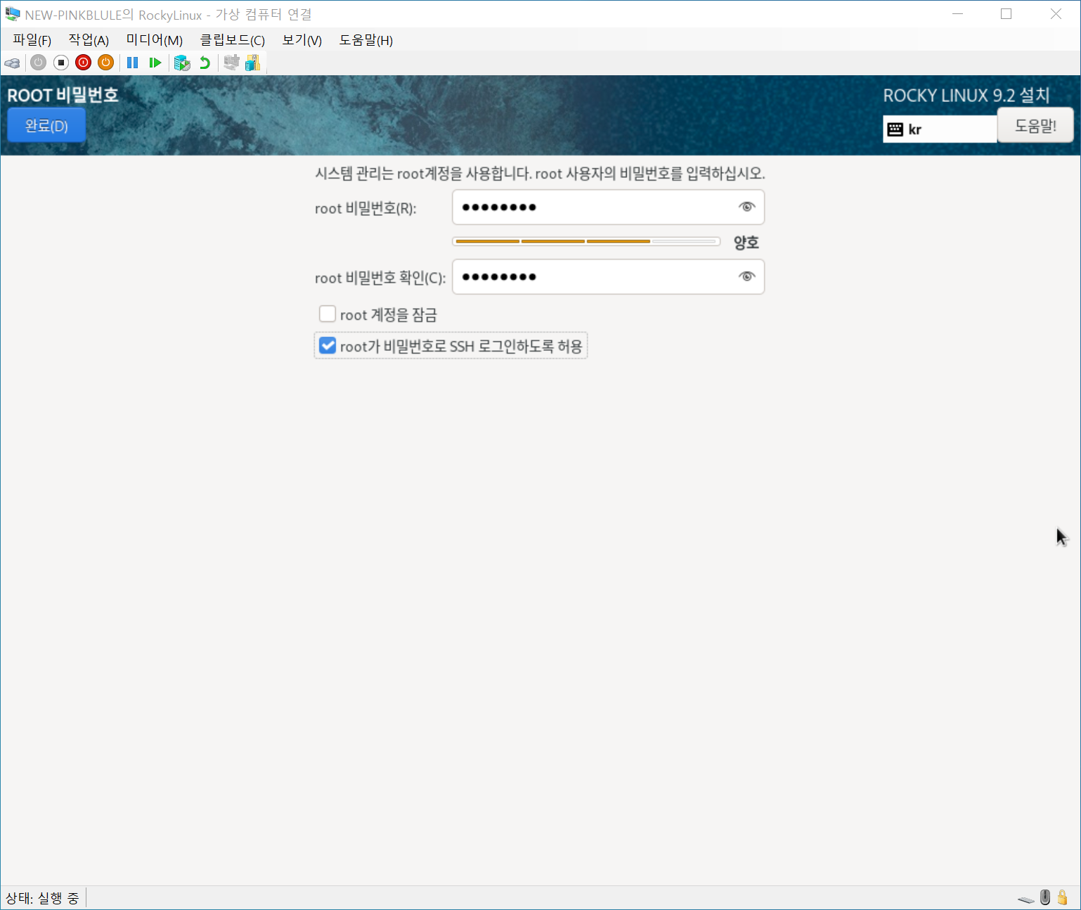기본으로 root가 비밀번호로 SSH 로그인하도록 허용은 체크안하도록 주의하시고 체크해제하신 상황에서