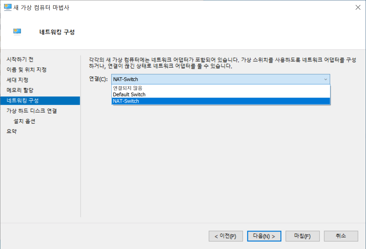 Hyper-V를 이용하여 바로 설치 시도 시, NAT 스위치를 기본 스위치만 나와서 설치 가능한데요.