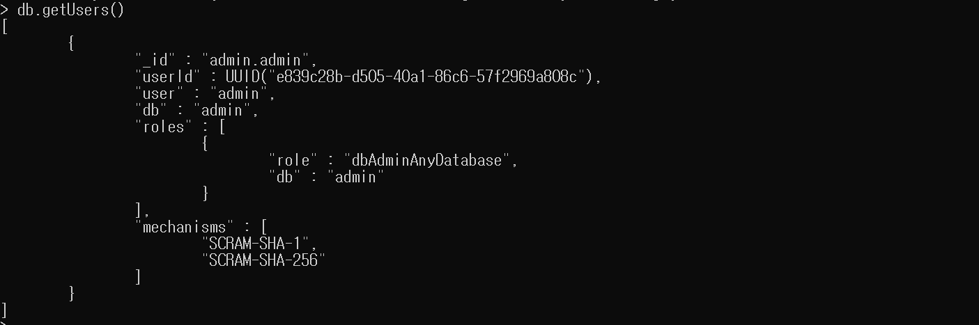 db.getUsers() 를 입력하여 잘 추가되었는지 확인할 수 있습니다. 또 다른 방법으로는