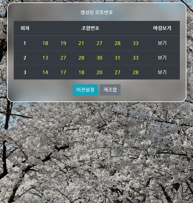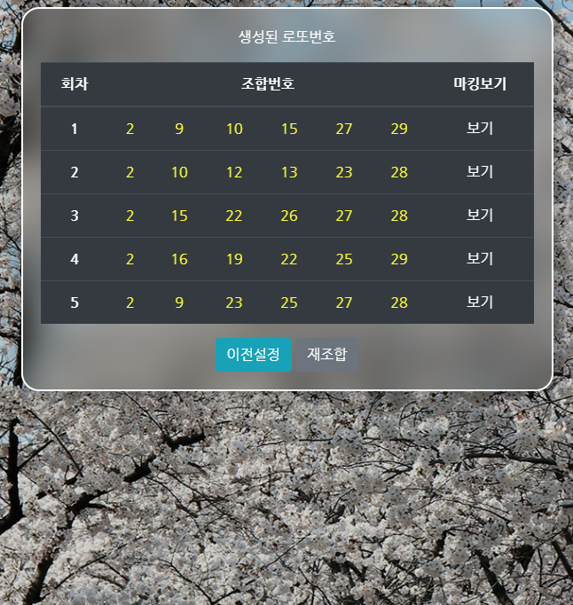 왼쪽화면을 보시면 27 일 들어간게 4번째만 들어가 있어요. 조합된 결과가 좀 아쉬워 우측 재조합 버튼을 클릭하여 다시 뽑아봤습니다.