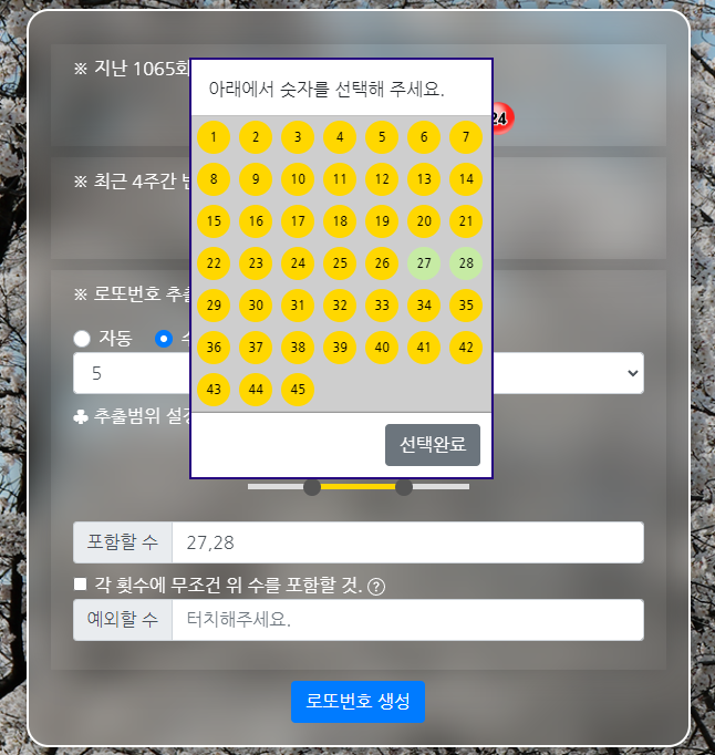 좌측 그림은 27, 28을 필수 포함 체크한 결과입니다. 체크를 한 후 생성 버튼을 누르면 좌측처럼 전 회차에 27, 28이 포함되어 나오는 것을 확인할 수 있습니다.